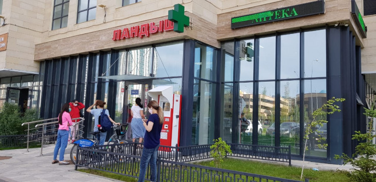 Ал "Аптека плюс" дәріханасының алдында адам қарасы көп. Кезекке тұрдық.