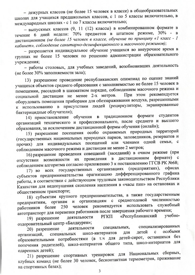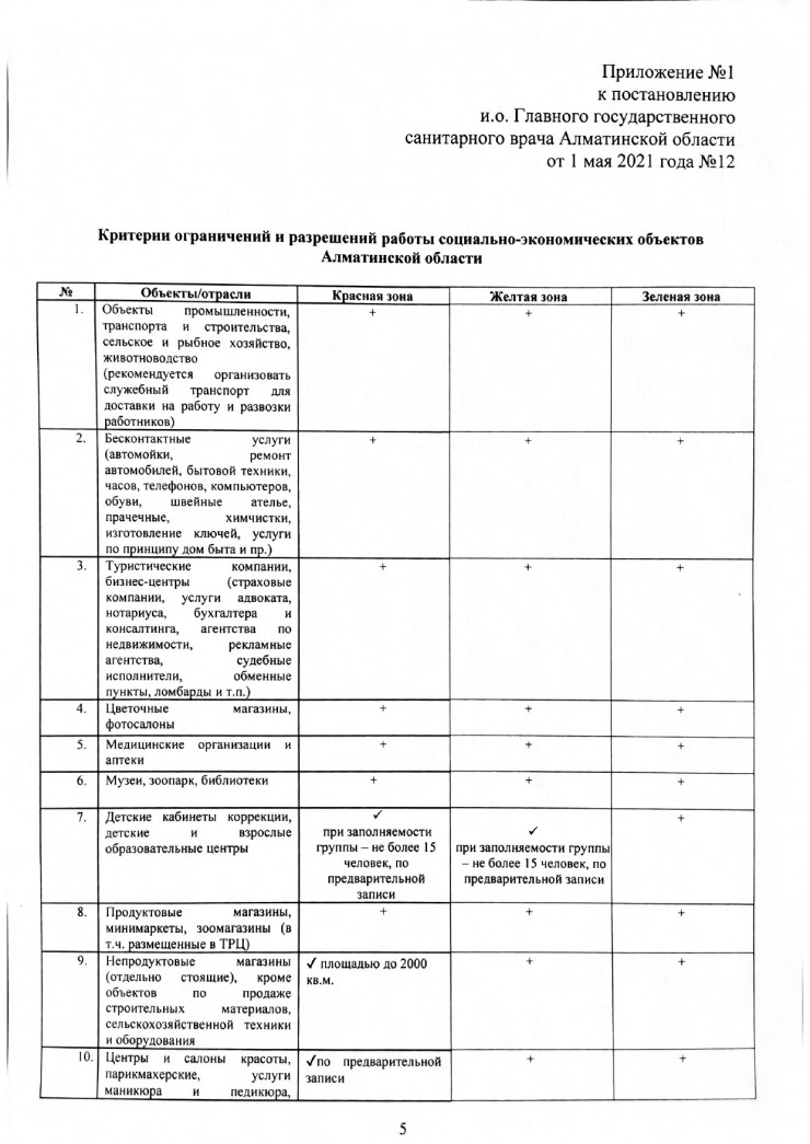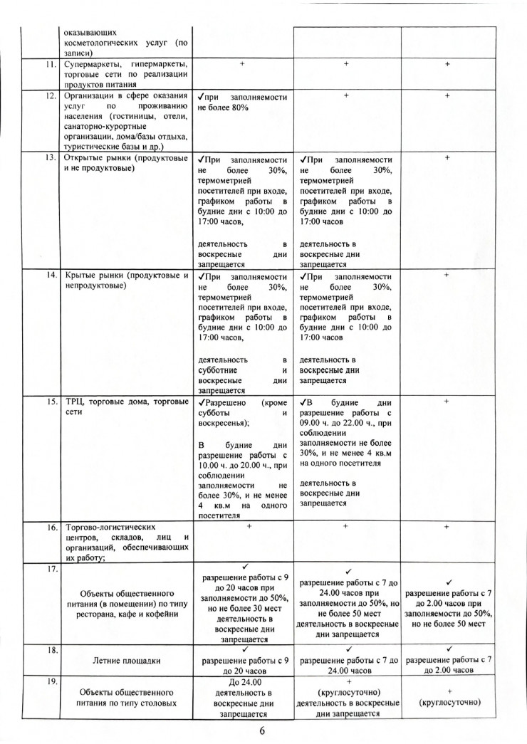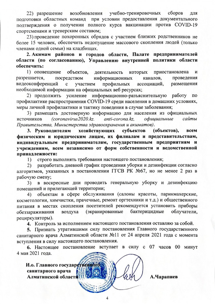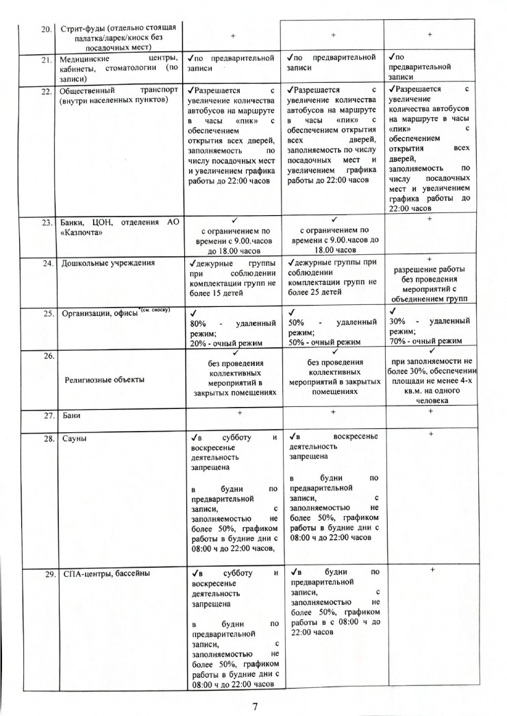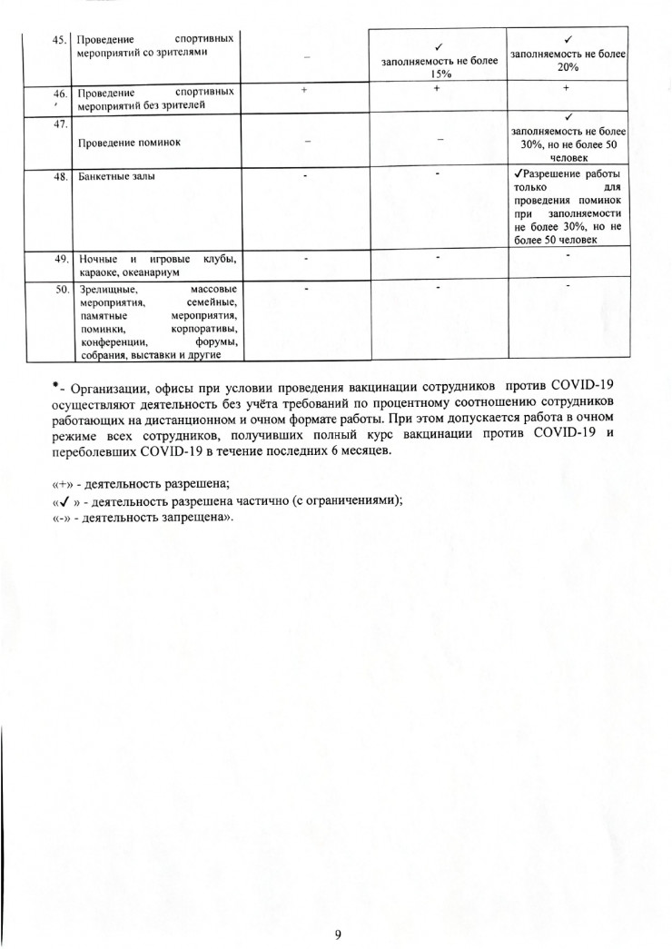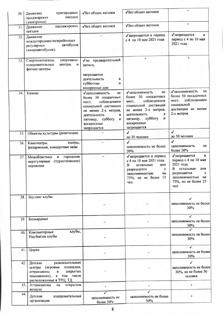 объекты общественного питания (за исключением банкетных залов и объектов по типу столовых, фаст-фудов и стрит-фудов), межобластные и городские нерегулярные (туристические) перевозки, бильярдные клубы, концертные залы, добровольные участники, караоке (с 5 мая), банкетные залы (с 5 мая), выставки, океанариум, марафоны, спортивные мероприятия со зрителями.