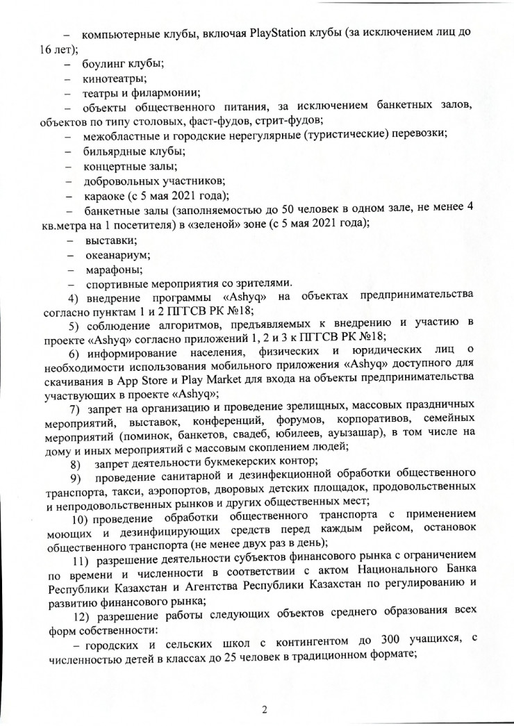 Согласно новым правилам, проект Ashyq масштабируется на объектах предпринимательства области. Среди них фитнес-клубы (включая йога-центры), спа-центры, сауны, бассейны, компьютерные клубы (включая PlayStation клубы (за исключением лиц до 16 лет), боулинг клубы, кинотеатры, театры и филармонии,