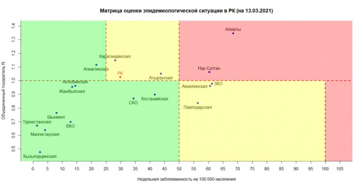 Опубликована матрица оценки эпидемиологической ситуации в регионах Казахстана на 13 марта 2021 года, передает Tengrinews.kz.