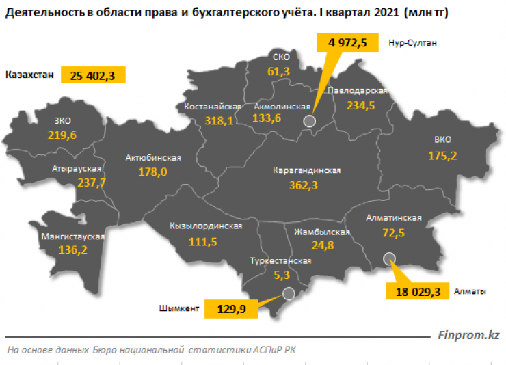 По итогам первого квартала 2021 года объем услуг, оказанных в области права и бухгалтерского учета, составил в Казахстан 25,4 миллиарда тенге тенге - на 11,3 процента меньше, чем годом ранее (ИФО - 80,6 процента).