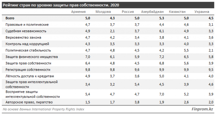 Среди стран СНГ права собственности лучше, чем в Казахстане, защищены в Азербайджане и Армении. Хуже, чем в Казахстане, показатели в России, Украине, Молдове.