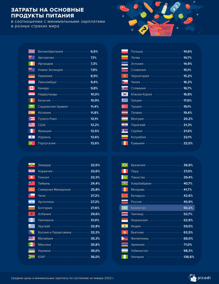 Кроме того, специалисты решили сравнить стоимость одних и тех же продуктов в разных странах и проверить, какой процент от официального минимального дохода пойдет на покрытие базовой продуктовой корзины.