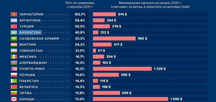"Казахстан в рейтинге занял 4-е место. 1 января 2022 года минимальная оплата труда в стране выросла на 40,9 процента - с 37 400 тенге до 52 701 тенге на руки. В России "минималка" выросла на 8,6 процента (24-е место рейтинга), в Узбекистане - на 21 процент (7-е место), - отметили аналитики.