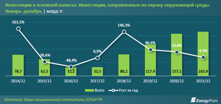 По итогам 12 месяцев прошлого года капитальные инвестиции, направленные на охрану окружающей среды, выросли на 4,3 процента, до 163,9 миллиарда тенге.