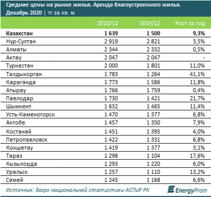 Самые высокие цены на неблагоустроенное жилье наблюдаются в Алматы (1,6 тысячи тенге), Нур-Султане (1,6 тысячи тенге) и Талдыкоргане (1,1 тысячи тенге за квадратный метр).