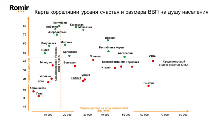 "Уровень счастья напрямую не связан с уровнем дохода. Мир перевернулся. Модель правильного государства, правильной идеологии, правильного накопления - рухнула в одночасье. Непонятны ориентиры. Будущее непредсказуемо..." - отметил доктор социологических наук, вице-президент Gallup International Андрей Милехин.