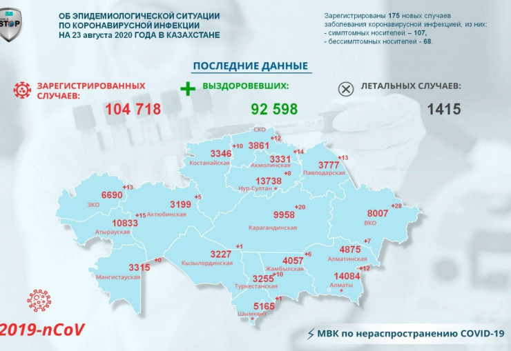 В Казахстане за прошедшие сутки (23 августа) выявлены 175 заболевших коронавирусной инфекцией, передает Tengrinews.kz.