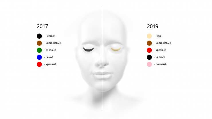 В компании "Яндекс" провели исследование на основе запросов пользователей Казнета с 2017 по 2019 годы. Согласно этим данным, в макияже глаз в последние годы стали очень популярны телесные оттенки. Также выросла популярность красного и розового цветов.