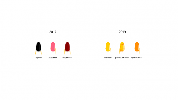Несмотря на то что в последние три года список вариантов маникюра практически не менялся, аналитикам удалось выяснить некоторые особенности. Например, в 2017-м стали гораздо больше спрашивать про черный маникюр, в 2018-м - про нюд. В прошлом году в моде был жёлтый лак, разноцветные и оранжевые ногти.
