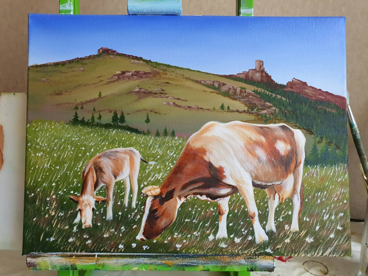 На картине изображены летний луг и пасущиеся на нем корова и теленок.
