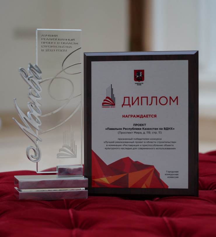 Павильон "Казахстан" на ВДНХ открылся в конце 2021 года после масштабной реставрации. Ему был возвращен исторический облик середины ХХ века. В декабре проект стал лауреатом конкурса "Московская реставрация - 2021" правительства Москвы, а в июле был удостоен Золотого знака ВДНХ за вклад в реставрацию и активную интеграцию в событийную повестку.