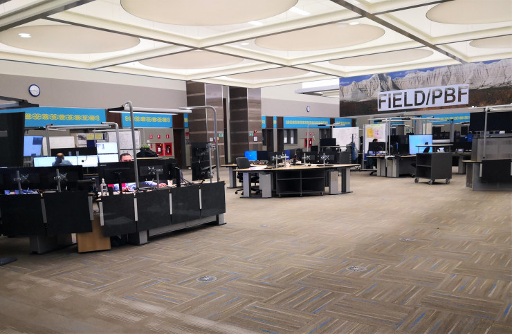 Следующая наша остановка – так называемое сердце тенгизского предприятия. Это Объединенный центр управления производством (ОЦУП), запущенный в июне 2022 года. Именно отсюда дистанционно ведется наблюдение и управление всеми сложными технологическими процессами. С виду неприметное взрывоустойчивое здание за высоким забором из колючей проволоки оборудовано новейшими цифровыми технологиями. Это единственный центр такого рода в нефтегазовой индустрии в Казахстане. Подобные объекты есть, к примеру, в США, но отличаются меньшим масштабом. К примеру, площадь здания операторской равна 2200 квадратным метрам и может вместить более 10 теннисных кортов.