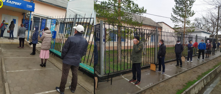 Однако в Талгаре, который находится в нескольких десятках километров от Алматы, сотрудникам банков и "Казпочты" удалось организовать "правильную очередь". Перед отделениями на улице расставлены стулья, расположенные на определенном расстоянии друг от друга.