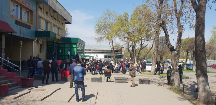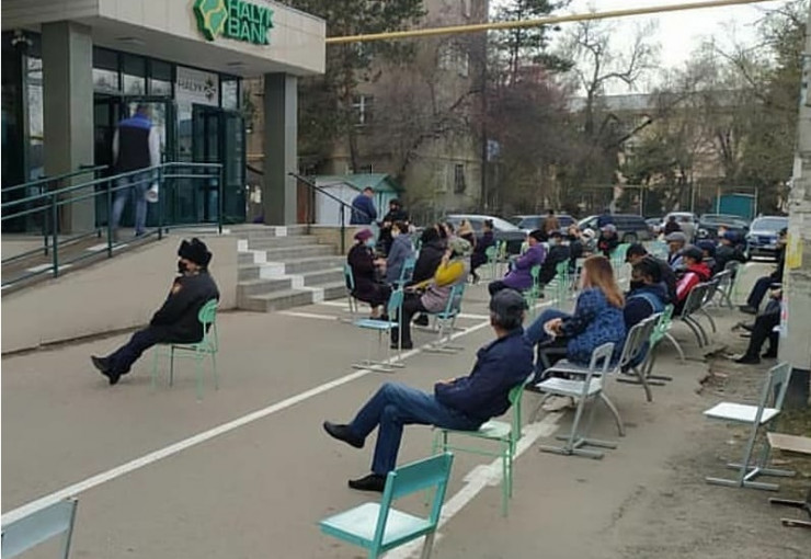Например, в Алматы люди с утра занимают очередь перед филиалом Halyk bank. Из-за действующего режима карантина в помещение пускают лишь по несколько человек. Некоторые ждут своей очереди, сидя прямо на бордюрах.