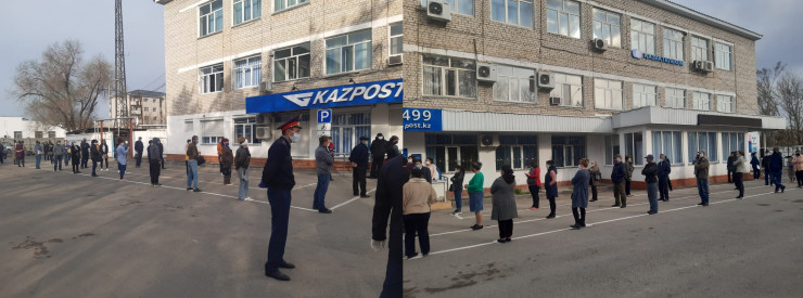 В других районах Алматинской области работники "Казпочты" также организовали дистанционную очередь. Перед филиалами нанесены пометки, где ожидают своей очереди клиенты.