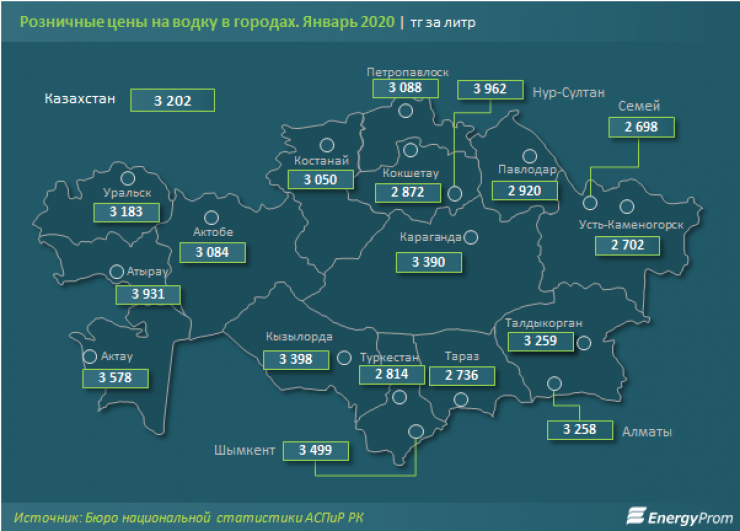 Самая дешевая водка в Семее (2698 тенге за литр), Усть-Каменогорске (2702 тенге за литр) и Таразе (2736 тенге за литр).
