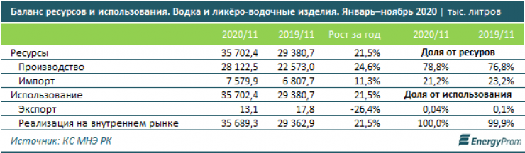 Отечественные предприятия по производству водки и ликеро-водочных изделий за январь – ноябрь 2020 года обеспечили местный рынок на 78,8 процента. На импорт пришлось 21,2 процента - чуть больше, чем в 2019 году. При росте производства на 24,6 процента за год импорт увеличился на 11,3 процента. При этом из Казахстана водка и ликеро-водочные изделия практически не экспортируются.