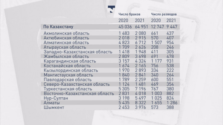 По количеству заключенных браков с начала года лидирует Алматы - 8 322. В числе лидеров также Туркестанская (7 196) и Алматинская области (6 712). По числу разводов на первом месте также оказался Алматы - 1 286 расторжений брака. В тройке лидеров также Алматинская (954) и Карагандинская области (931).
