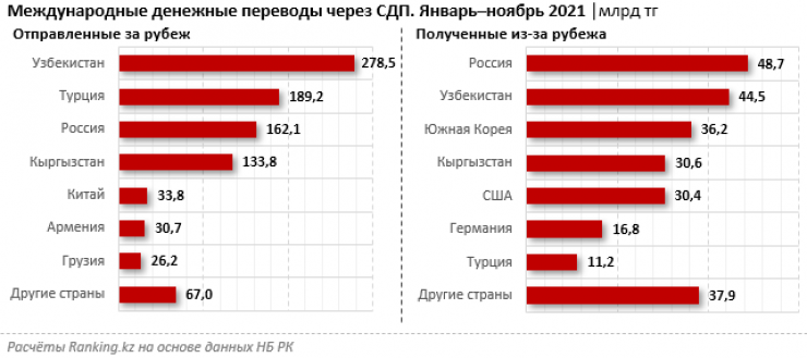 "В разрезе стран по объему отправленных из страны денежных переводов с января по ноябрь 2021 года лидируют Узбекистан (278,5 миллиарда тенге), Турция (189,2 миллиарда тенге) и Россия (162,1 миллиарда тенге), на которые совокупно приходится более двух третей объема", - уточнили в Ranking.kz.