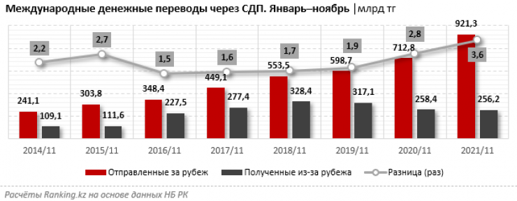 "Объем международных денежных переводов физлиц через системы денежных переводов, отправленных за рубеж с января по ноябрь 2021 года, составил 921,3 миллиарда тенге - на 29,2 процента больше, чем за тот же период в 2020 году", - говорится в сообщении.