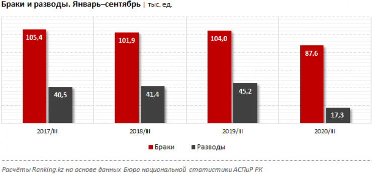 За три квартала 2020 года в стране было зарегистрировано 87,6 тысячи браков и 17,3 тысячи разводов. По сравнению с аналогичным периодом прошлого года количество браков сократилось на 15,7 процента, в то время как количество разводов - сразу в 2,6 раза.