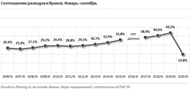 При этом уточняется, что динамику разводов в Казахстане будет иметь смысл анализировать после снятия всех ограничений, когда вернутся к обычному графику работы все государственные институты и инстанции, а благосостояние населения восстановится до прежнего уровня. Не исключено, что картина поменяется и "коронавирусные" разводы мы увидим позже.