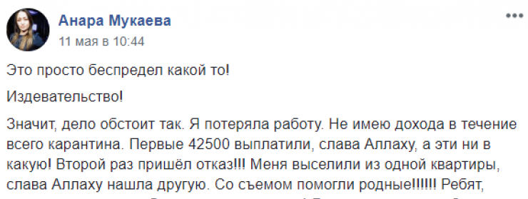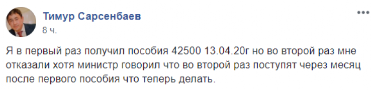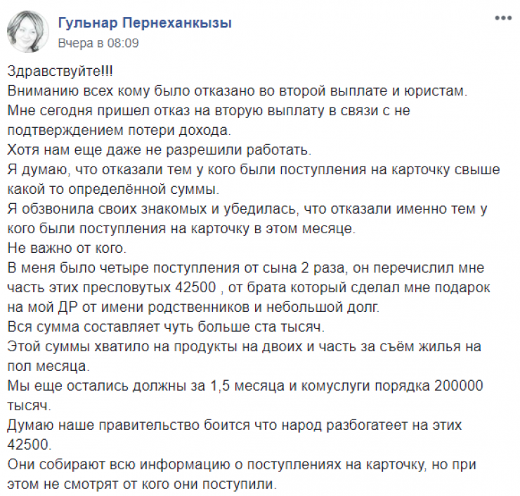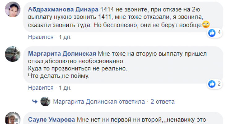 В социальных сетях общественники создали специальные группы, где люди делятся проблемами, связанными с 42 500 тенге. И таких публикаций накопилось в сети немало. Люди жалуются, что не могут получить ответов на свои вопросы.