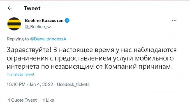 Beeline компаниясы Twitter-де шағым айтып жатқандарға мобильді интернеттің жұмысындағы ақаулар "компанияға тәуелді емес себептерге" байланысты деп жауап берді.