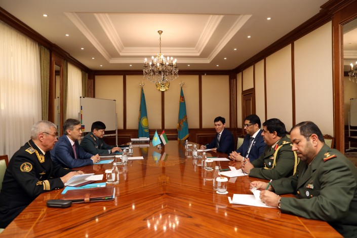 В Астане министр обороны РК Нурлан Ермекбаев провел встречу с чрезвычайным и полномочным послом Объединенных Арабских Эмиратов Мохаммадом Альджабером и военным атташе при посольстве ОАЭ бригадным генералом Рашедом Аль-Мехрази.