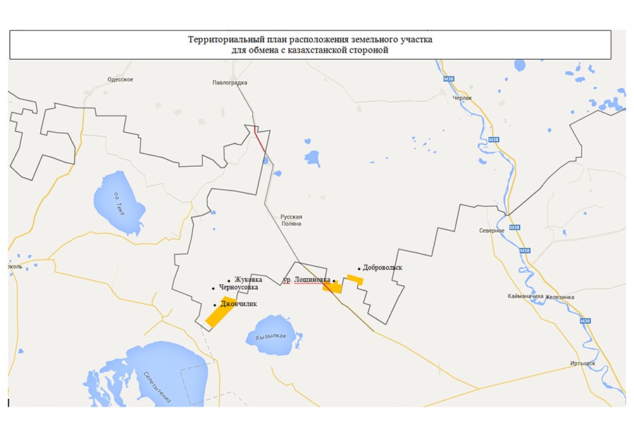 Взамен Омская область готова отдать Казахстану участок, равный по площади и по климатическим условиям. "Соседям предстоит выбрать один из двух вариантов обмена: в первом случае казахстанцам отдадут участок площадью 2427 гектаров, что в 12 километрах южнее села Черноусовка, во втором - 2 участка общей площадью 2402 гектара вблизи урочища Лощиновка", - говорится в статье.