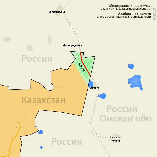 Для наглядности ситуации с обменом обратимся к карте. Судя по ней, казахстанская граница клином "вторгается" на территорию Омской области, между двух сел - Милоградовка (720 жителей, около 40 процентов казахов) и Алабота (1600 жителей, 20-25 процентов казахов). Села соединяет участок дороги Омск - Русская Поляна длиной 9,6 километра, проходящий по землям Казахстана. "На территории казахстанского "клина" (на карте отмечен зеленым. - Прим.) нет сел - в администрациях Павлоградского и Русско-Полянского районов сообщили, что там находятся поля", - сообщает НГС.