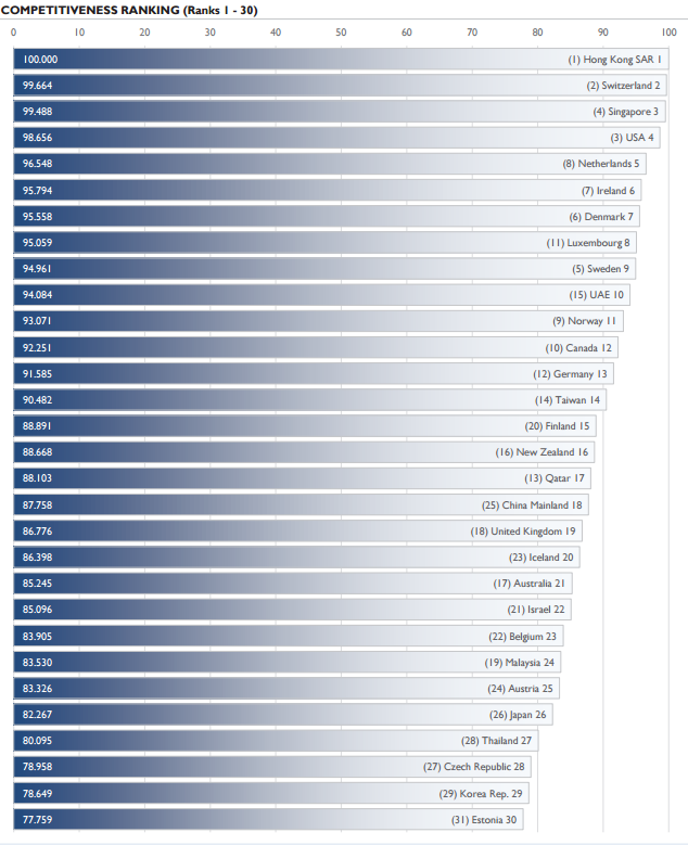 Конкурентоспособность стран в рейтинге оценивается по 20 параметрам, разделенным на четыре категории: показатели экономики, эффективность правительства, эффективность бизнеса и инфраструктура. Сами параметры, в свою очередь, состоят из 323 разнообразных переменных - от вклада в мировой ВВП, цен на бензин и уровня налоговых ставок до стоимости капитала, прозрачности государственной политики и открытости национальной культуры для иностранных идей.