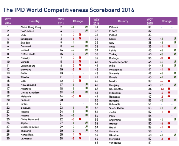 Согласно последнему выпуску мирового рейтинга конкурентоспособности (The World Competiveness Scoreboard-2016), Казахстан показал самое сильное падение - с 34-го на 47-е место.
