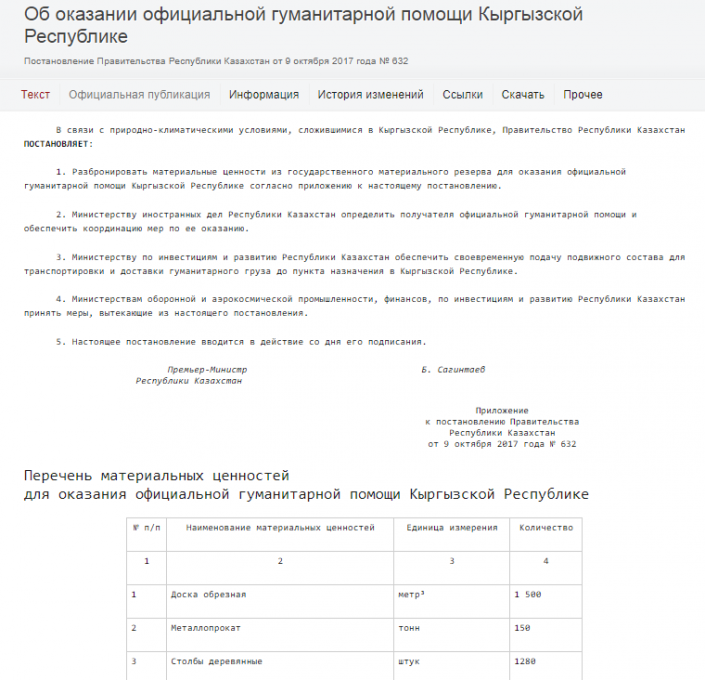 Об этом сообщается в постановлении правительства РК от 9 октября 2017 года № 632 "Об оказании официальной гуманитарной помощи Кыргызской Республике", опубликованном в системе "Әділет".