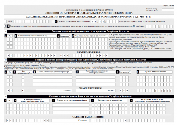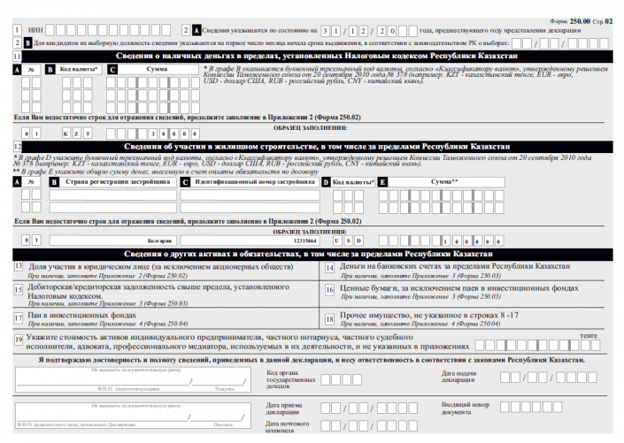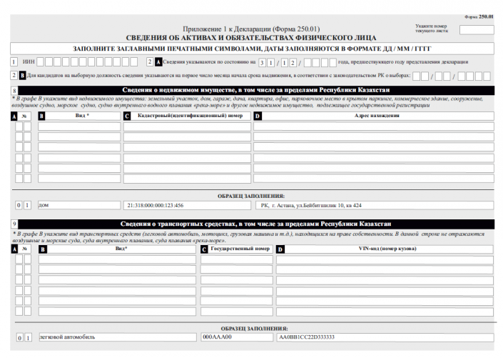 К примеру, в графе 9 "Сведения о транспортных средствах, в том числе за пределами Республики Казахстан" указывается вид транспорта (легковая, грузовая и прочее), госномер и VIN-код.