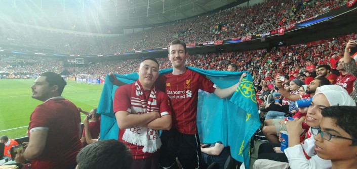Помимо традиционных флагов "Ливерпуля", казахстанцы привезли и флаги своей страны.