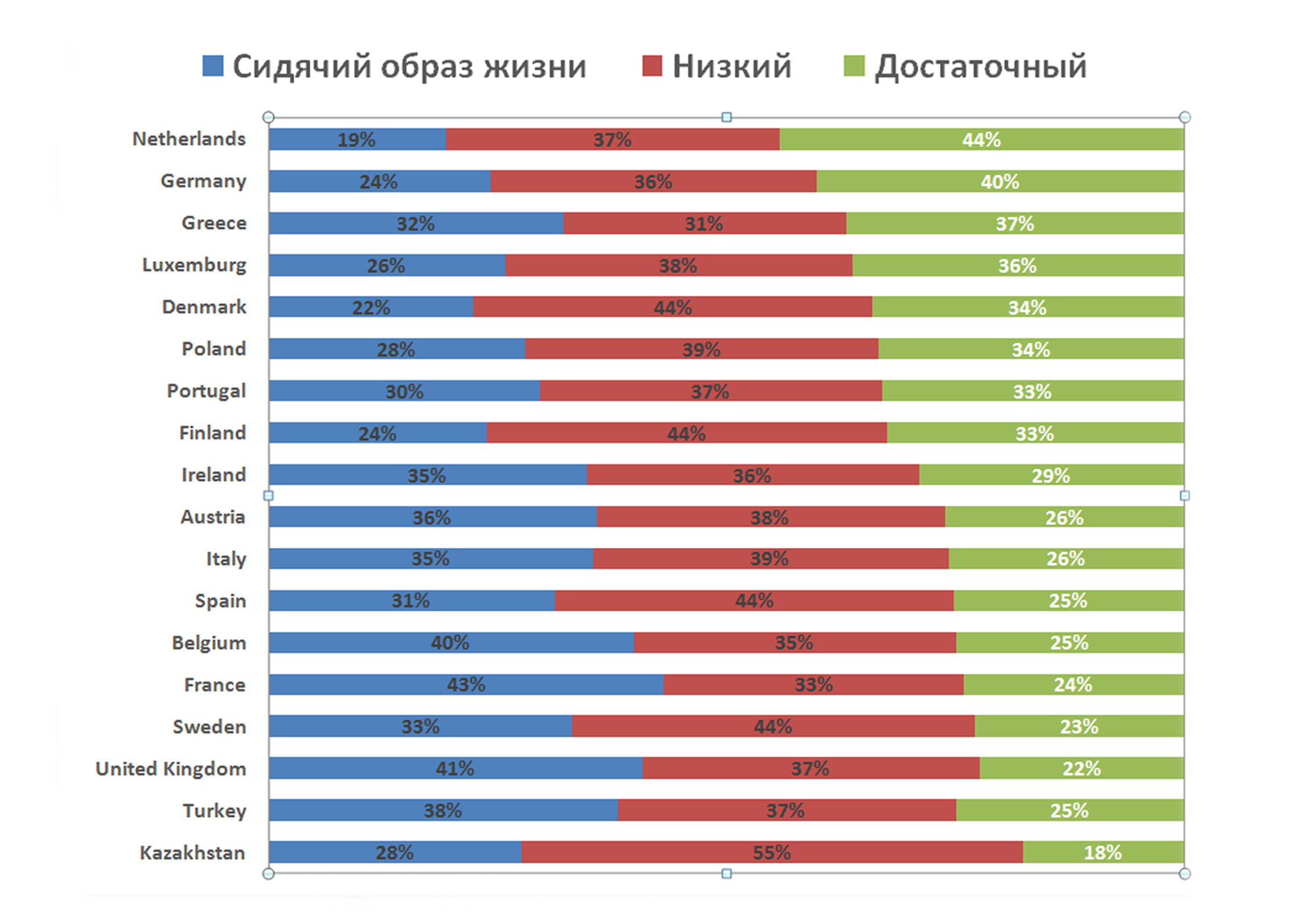 Также результаты исследований показали, что практически половина граждан республики малоподвижны и ведут в основном сидячий образ жизни. Дневной рацион казахстанцев состоит в основном из мяса, хлеба и мучных изделий с явным преобладанием углеводов. По словам экспертов, все это ведет к избыточной массе тела. Так, директор Центра диабета при КазНПУ имени С.Д. Асфендиярова Жанай Аканов заявил, что показатель индекса массы тела у 41 процента опрошенных превышает норму, а развитие сахарного диабета второго типа потенциально возможно в группах населения с избыточной массой тела и низким уровнем физической активности.