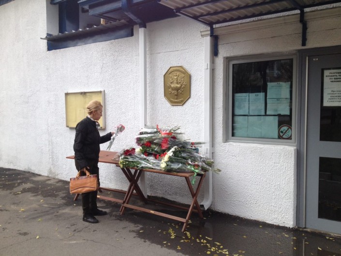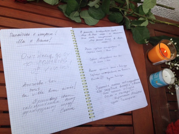По словам охранника консульства, люди начали приходить с самого утра - примерно с 8.00. Возле двери к зданию был организован специальный стол, на который приходящие могли складывать цветы. Также на нем стояли несколько горящих свечей и "Книга соболезнований". По словам охранника консульства, к обеду выразить свои соболезнования по погибшим во время теракта в Париже пришли более 70 человек.
