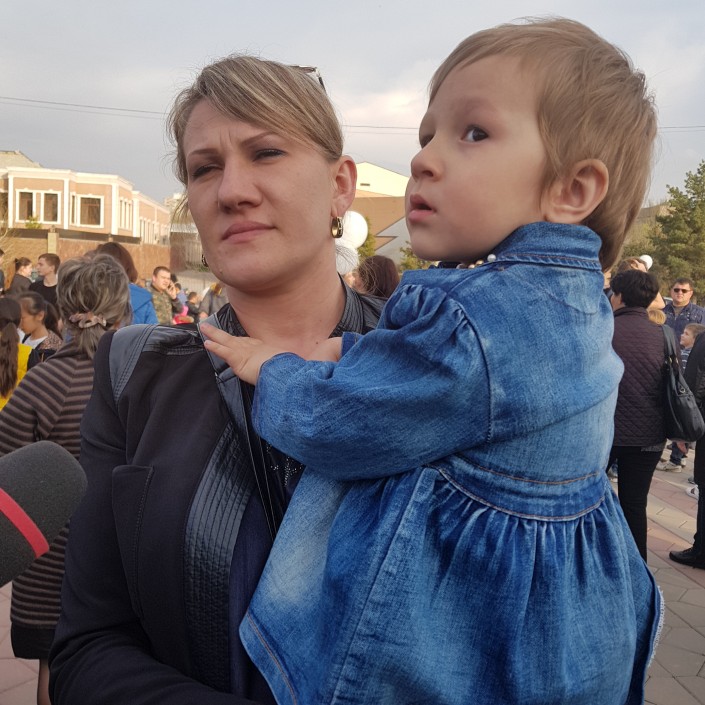 Многие пришли на акцию с детьми. Молодая женщина прижала к себе своего малолетнего ребенка. Увидев камеру, попыталась взять себя в руки.