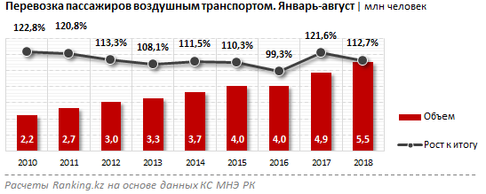 Количество пассажиров воздушного транспорта за январь-август 2018 года составило 5,5 миллиона человек, что на 12,7 процента больше, чем за аналогичный период прошлого года.
