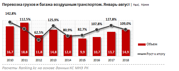 Доля воздушного транспорта от всего объема перевозок грузов и багажа совсем невелика - всего 0,001 процента, или 14,9 тысячи тонн (на 9 процентов больше, чем в прошлом году).