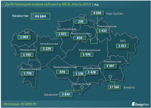 На втором месте - Нур-Султан: 4,7 тысячи - на 49,6 процента меньше, чем за аналогичный период прошлого года. Замыкает тройку лидеров Алматинская область: 3,4 тысячи компаний - на 2,6 процента меньше, чем в конце июля 2018 года.