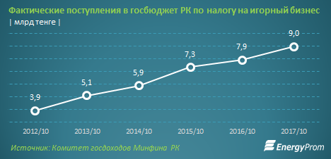 В частности, по итогам десяти месяцев текущего года фактические сборы по налогу на игорный бизнес в РК составили почти девять миллиардов тенге, что на 13,5 процента больше суммы, выплаченной в госбюджет за аналогичный период прошлого года.