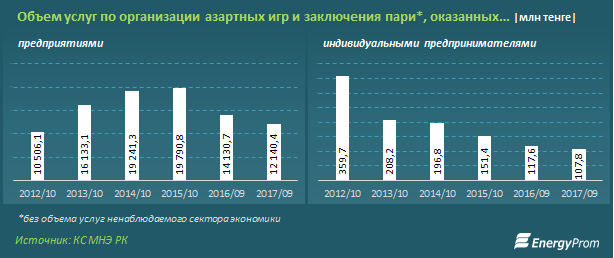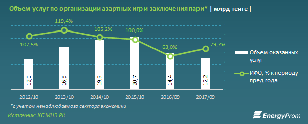 Сокращается не только физический объем услуг в отрасли, но и также стоимостное их выражение. Так, стоимость деятельности по организации азартных игр и пари за девять месяцев текущего года оценивается в 12,2 миллиарда тенге, или на 15,2 процента меньше суммы за аналогичный период 2016 года.