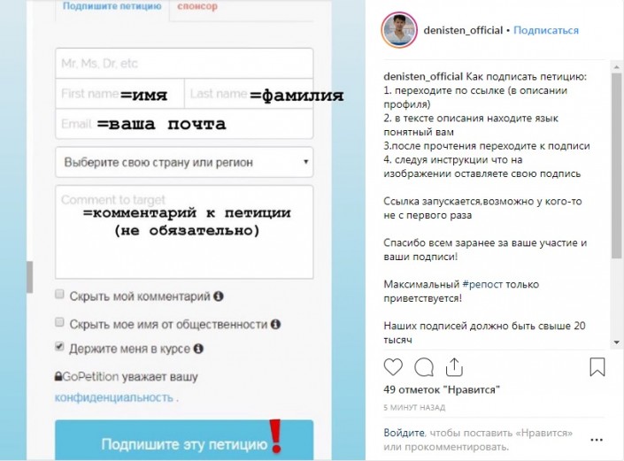Чтобы подписать петицию, необходимо пройти по ссылке. В тексте описания нужно выбрать язык, затем заполнить строки в столбике справа, кликнуть на кнопку "Подпишите эту петицию".