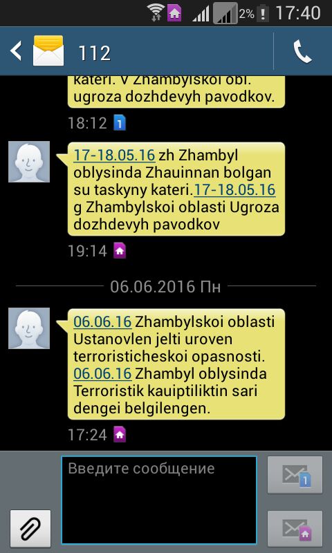 В Казахстане введен желтый уровень террористической опасности. Тревожное известие пришло жителям Западно-Казахстанской, Карагандинской, Алматинской, Павлодарской, Мангистауской, Кызылординской, Жамбылской и других областей, а также Астаны и Алматы, сообщает корреспондент Tengrinews.kz. В начале четвертого вечера казахстанцы стали получать SMS с сообщением о том, что в области введен умеренный – "желтый" уровень террористической опасности.