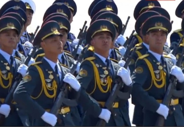 От Казахстана в параде приняла участие рота почетного караула Аэромобильных войск Вооруженных сил РК. По главной площади Китая прошли 32 "коробки" военнослужащих, из них 15 - отряды страны-хозяйки. Казахстанцы прошли седьмыми по счету среди иностранных войск под звуки китайского марша.