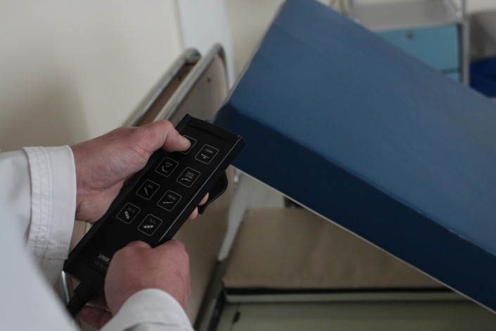 На кровати также есть педали, чтобы регулировать высоту и расстояние, а также тормоз. Когда необходимо, кровать снимается с тормоза, и можно перевозить пациентку в другие отделения.