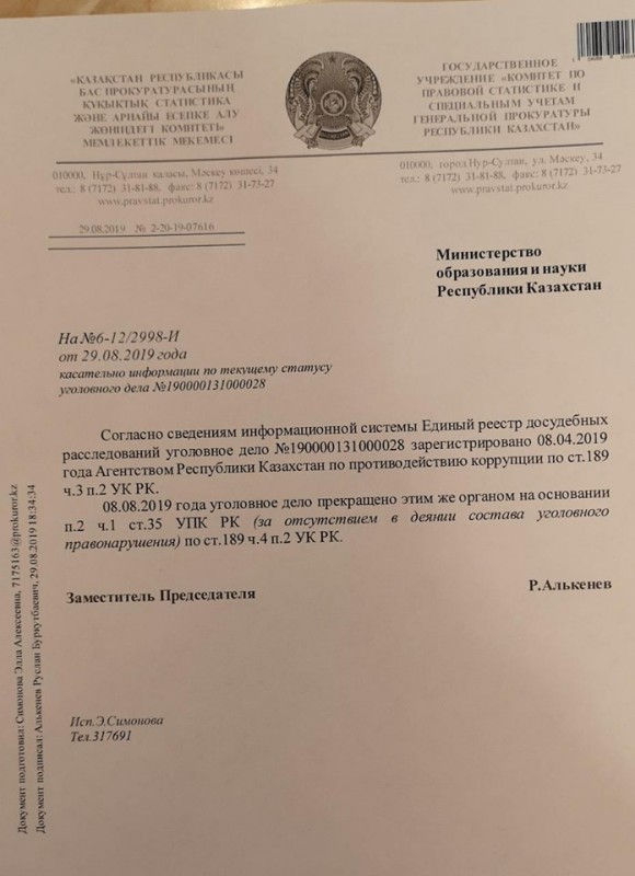 Тщательная проверка по делу с обвинениями в мой адрес в настоящее время завершена (документ прилагаю). Соответственно, все обвинения Анар Каирбековой в мой адрес беспочвенны.